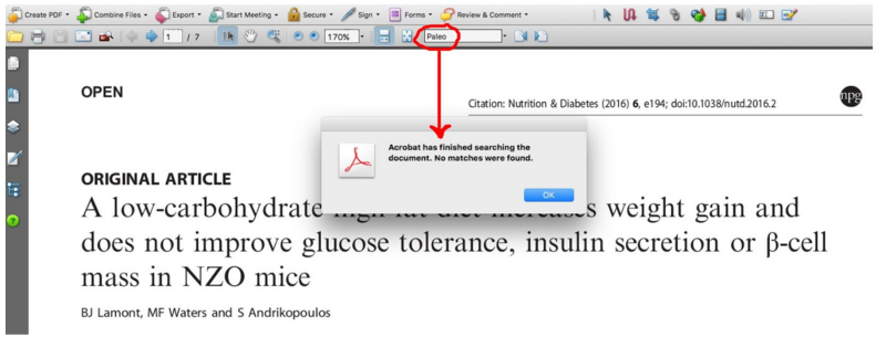 Of course the click-bait title of this article, “Paleo diets = weight gain”, is a little different from that of the journal paper in question. In fact, if you download the PDF version of the study and then search for the word Paleo or Paleolithic within Adobe Acrobat, you’ll discover something rather interesting. The word Paleo (or Paleolithic) isn’t used once in the actual paper!